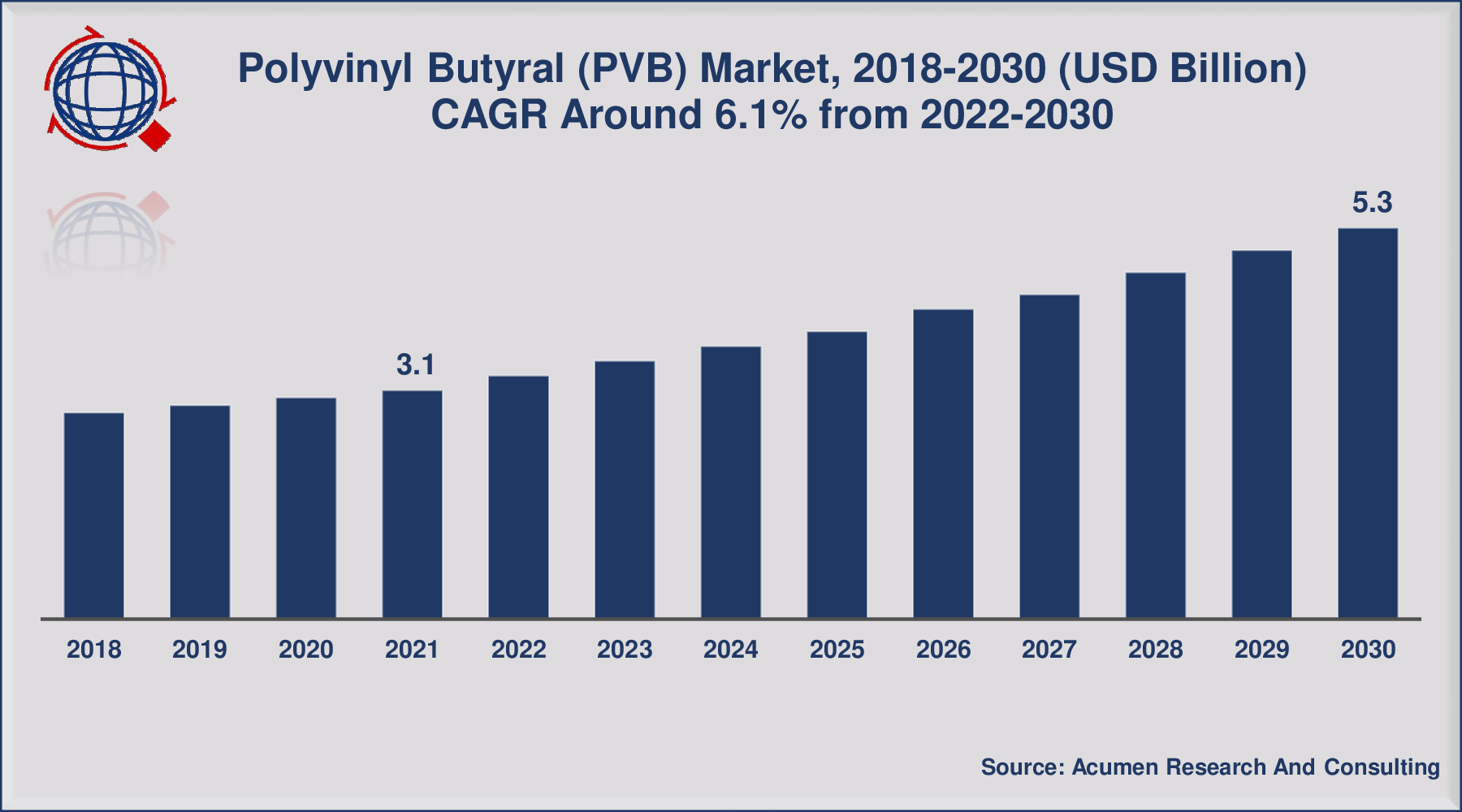 - Global polyvinyl butyral market revenue was worth USD 3.1 billion in 2021, with a 6.1% CAGR from 2022 to 2030
